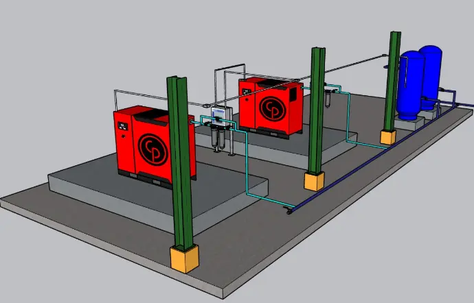 Creamos diseños 3D precisos y cálculos técnicos para optimizar el espacio y la eficiencia en la instalación de cuartos de compresores.
